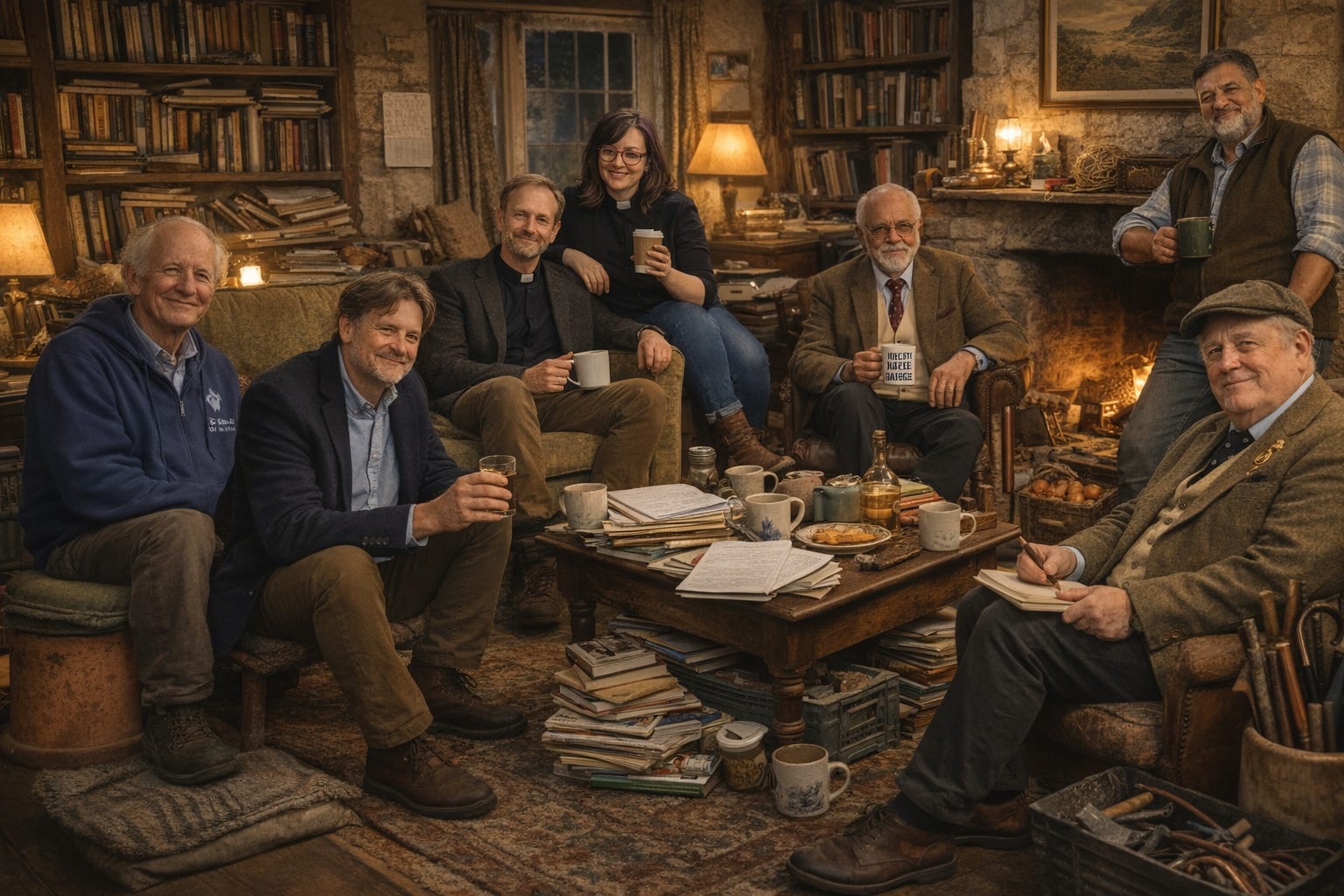 Thus fortified, they settled once more into the familiar arrangement. Tim on the sofa. Sandy on the arm of it. Lionel upright, this week holding a mug advertising a steam rally in Dorset, which he regarded as tolerable. Perry on the folding stool, notebook ready. Abe nearest the books. Kevin at the edge of the hearthrug on the three-legged milking stool. Horse against the mantelpiece, preserving his customary posture of principled semi-participation. Leslie, serene as ever, upon the flower-pot.